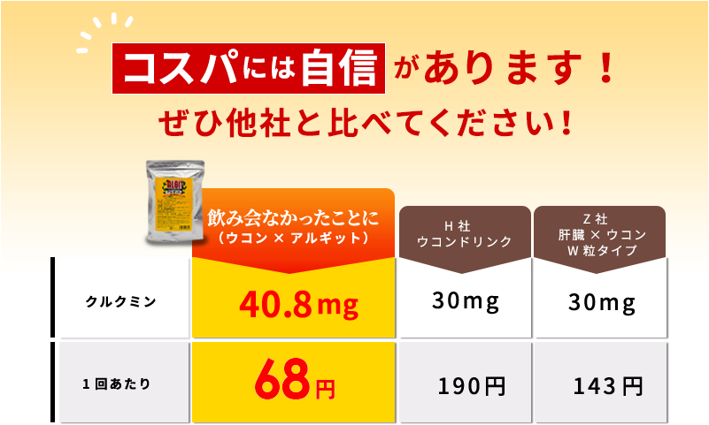 このウコンアルギットを飲むようになってからは、悪酔いや二日酔いをしないので、楽しくお酒を飲めるようになりました。